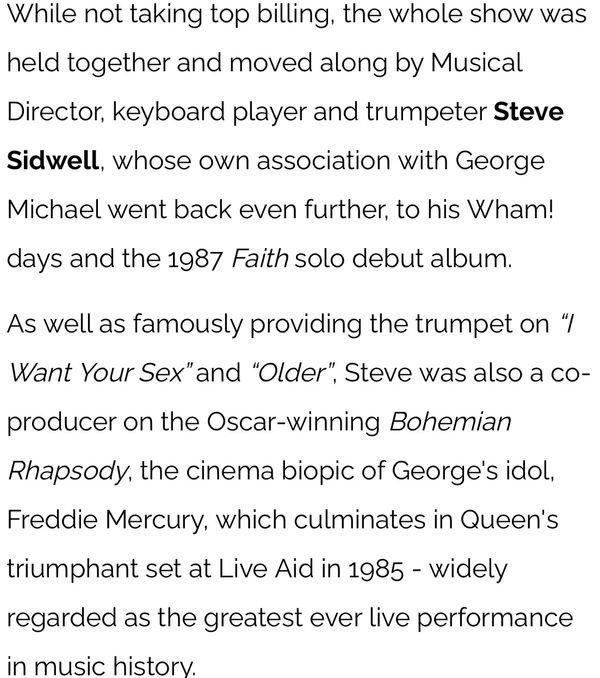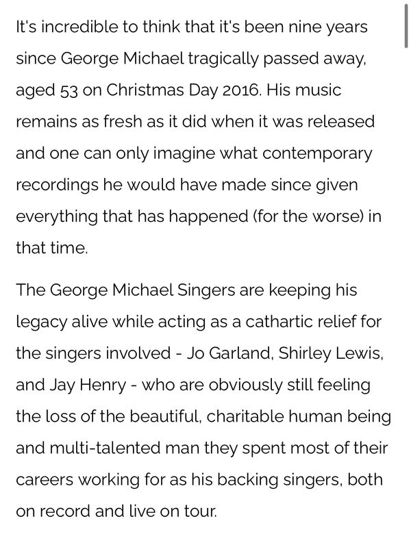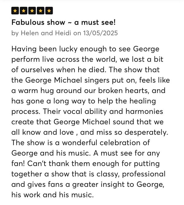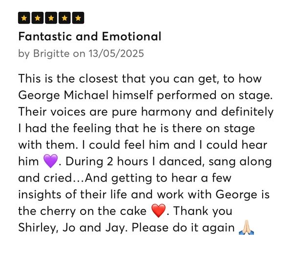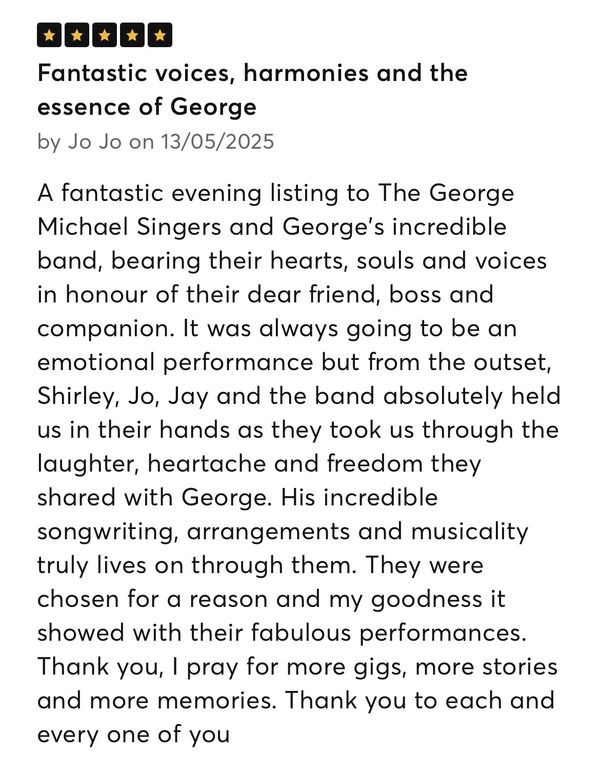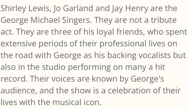 The ultimate celebration of George Michael's music, brought to you by the singers who performed and recorded with him for over 30 years. Following a completely sold out show at london's iconic Shepherds Bush Empire , Shirley Lewis, Jo Garland and Jay Henry are bringing this truly unique show across the UK.